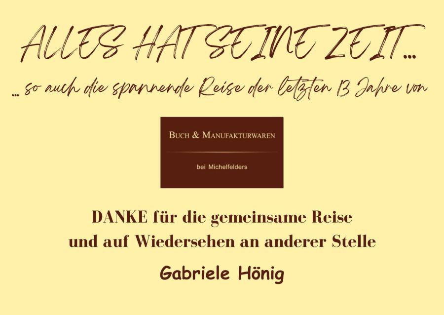 Ich möchte mich bei jedem einzelnen ganz herzlich bedanken, der mein Konzept in den letzten 13 Jahren mitgetragen und unterstützt hat. Unsere monatlichen Veranstaltungen, die Lesereisen, die Künstler und Autoren, die Lieferanten und natürlich SIE als Kunde, die vielen Gespräche und der Austausch mit vielen tollen Menschen – all das war eine spannende Reise, die ich in dieser Zeit unternehmen durfte und die auch nur durch die Unterstützung der Familie und der engagierten Mitarbeitenden funktioniert hat.