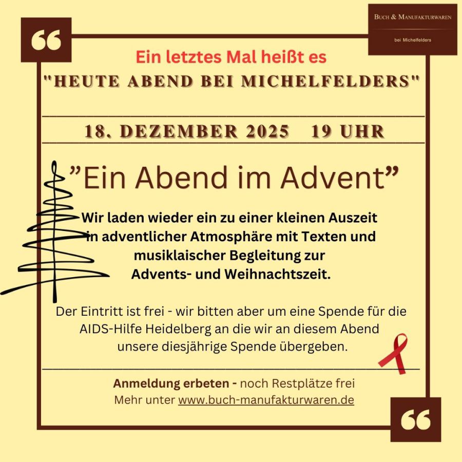 Am 06. Dezember jährte sich zum 5. Mal der Tag, an dem sich die Türen zu Buch & Manufakturwaren öffneten. Das Team lud alle dazu ein, an diesem Tag mit ihnen darauf anzustoßen und nutzte den Termin auch, an Frau Emling von der AIDS-Hilfe Heidelberg auch bereits zum 5. Mal ihre Jahresspende zu übergeben. Der Betrag wurde auf 500 Euro aufgrundet.